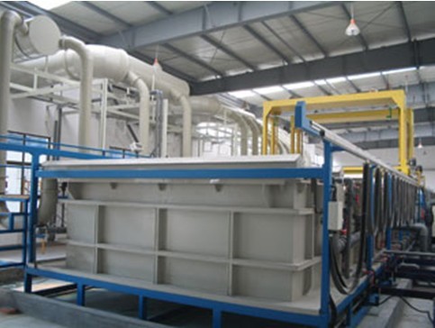金磊電鍍園占地80余畝,投資2.1億元,設有鍍鋅生產線、鍍銅鎳鉻生產線、塑料鍍生產線、鍍硬鉻生產線、氧化∕陽極氧化生產線、電泳生產線、噴涂生產線、電子連續鍍生產線等,建成54m×18m×7m